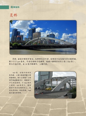 青春指南 61 灵桥 灵桥,省级文物保护单位。位跨奉化江下游,连接药行街东端与百丈路西端, 距三江口 400 余米,宁波古城标志性建筑,始建于唐穆宗长庆三年(823 年), 原为木造浮桥,由 16 条木船排列,上辅木板。 1931 年,由旅沪甬商发 起改建,上海工部局英籍工程 师詹姆森、新仁记营造厂工程 师竺泉通勘查设计,德国西门 子公司总承包,于 1934 年开 工建设,1936 年完工。据传 建桥时有彩虹横贯其上,故 名为灵现桥,后称灵桥。1994 年扩建拓宽桥面。